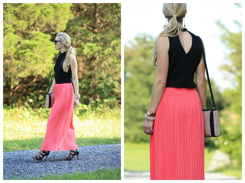 black keyhole back crop top, coral pink pleated midi skirt, low ponytail, black lace up heels July 29, 2014 by Meagan 0 Comments