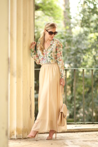 floral print blouse with maxi skirt, how to wear a button down shirt with a maxi skirt, Chic Wish nude chiffon maxi skirt, Stuart Weitzman Nudist sandals adobe leather, Louis Vuitton st. germain in dune, Italian fashion blog April 20, 2015 by Meagan 0 Comments