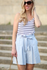 paperbag waist shorts, nautical inspired outfit, navy striped tank with high waist shorts, how to wear high waist shorts, Estee Lauder ‘Surreal Sun’ coral lipstick May 26, 2015 by Meagan 0 Comments
