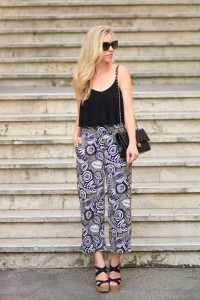 LOFT tropical wide leg cropped pants, culottes with crop top outfit, Express cropped camisole, Chanel medium classic black bag, how to wear wedge sandals with culottes July 21, 2015 by Meagan 0 Comments