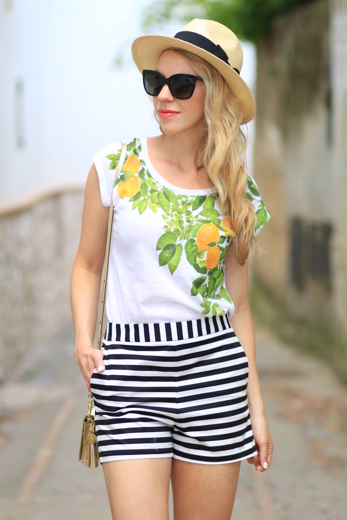 Express black and white striped high waist shorts, Milly for Kohls lemon print shirt, panama hat outfit, best things to pack for island vacation Capri July 29, 2015 by Meagan 0 Comments