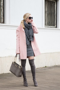 pink cocooon coat with gray dress, winter pastel coat outfit, Stuart Weitzman Highland gray over the knee boots, gray and pink outfit, pink coat outfit