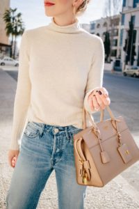 Meagan Brandon fashion blogger shows how to style cream white turtleneck sweater for spring with nude Prada satchel January 27, 2019 by Meagan 0 Comments