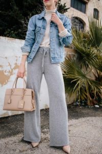 Meagan Brandon fashion blogger of Meagan’s Moda wears light blue Levi’s denim jacket with cream turtleneck, wide leg cashmere pants and nude Prada bag for chic spring outfit wearing knits March 5, 2019 by Meagan 0 Comments