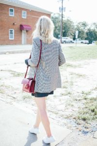 Meagan Brandon fashion blogger of Meagan’s Moda shows what to wear with an oversized blazer for fall with mini skirt and white sneakers August 29, 2019 by Meagan 0 Comments